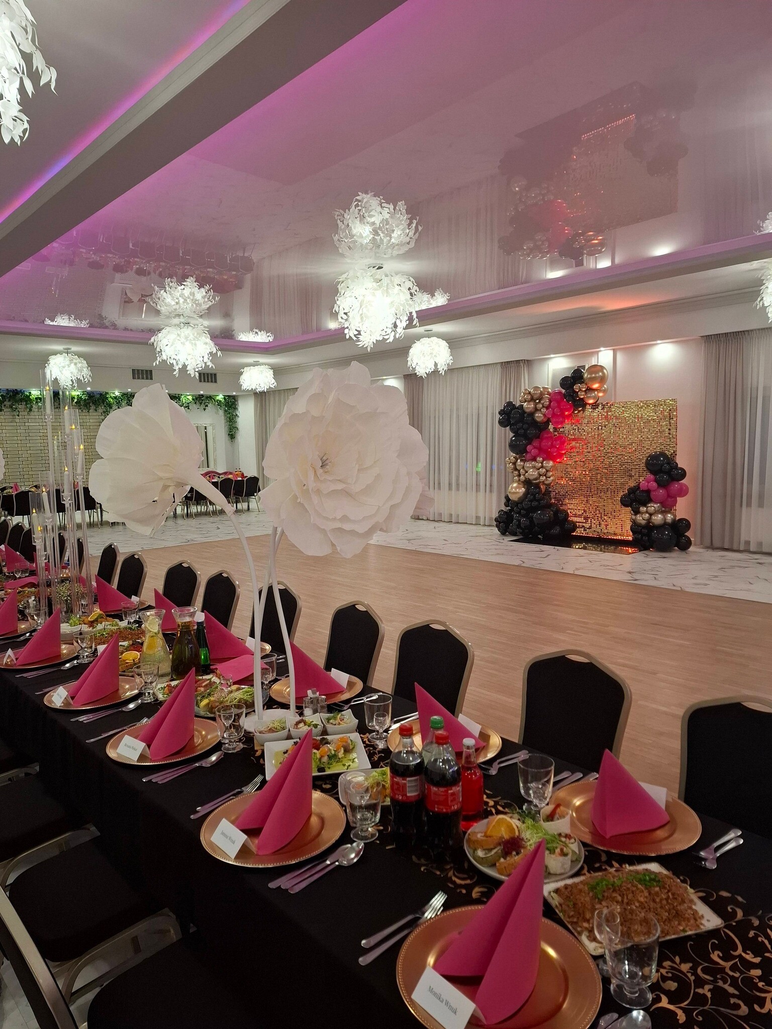 Sala mieszcząca do 300 osób z wieloma dodatkami przy uroczystości weselnej lub balowej.